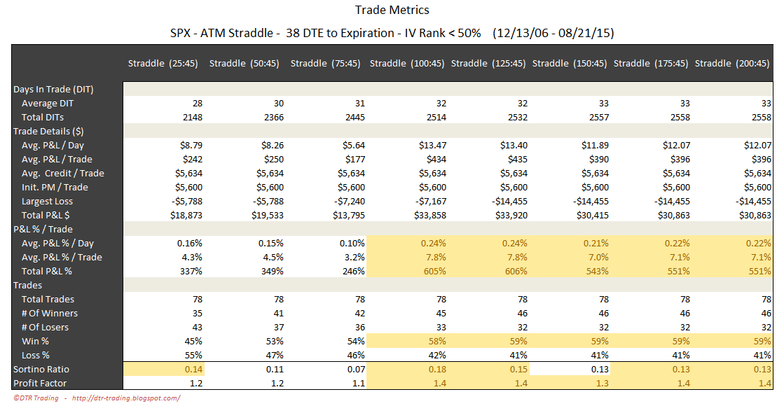 For background on the setup for the backtests, as well as the nomenclature used in the charts and tables below, please see the introductory article for this series: Option Straddle Series - P&L Exits.